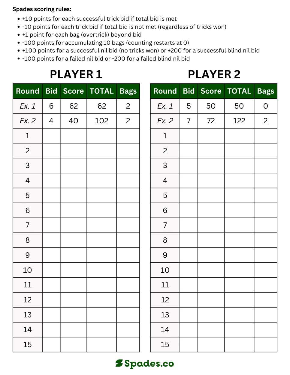 Printable Scoring Sheet For Two Player Spades Spades
