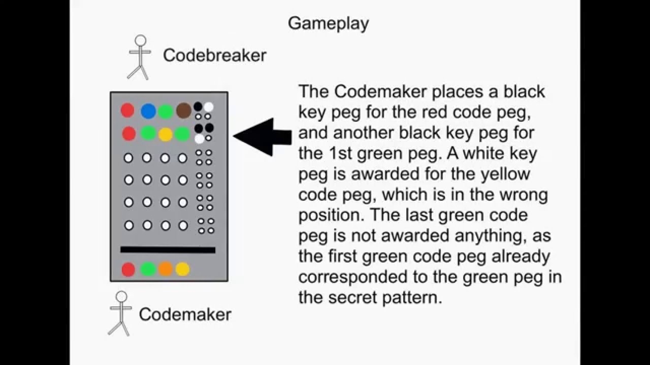 The game features a code-making board with colored pegs that represent different colors. The code-breaker makes guesses by placing pegs on the board, and the code-setter provides feedback using black and white pegs to indicate correct colors and correct positions.