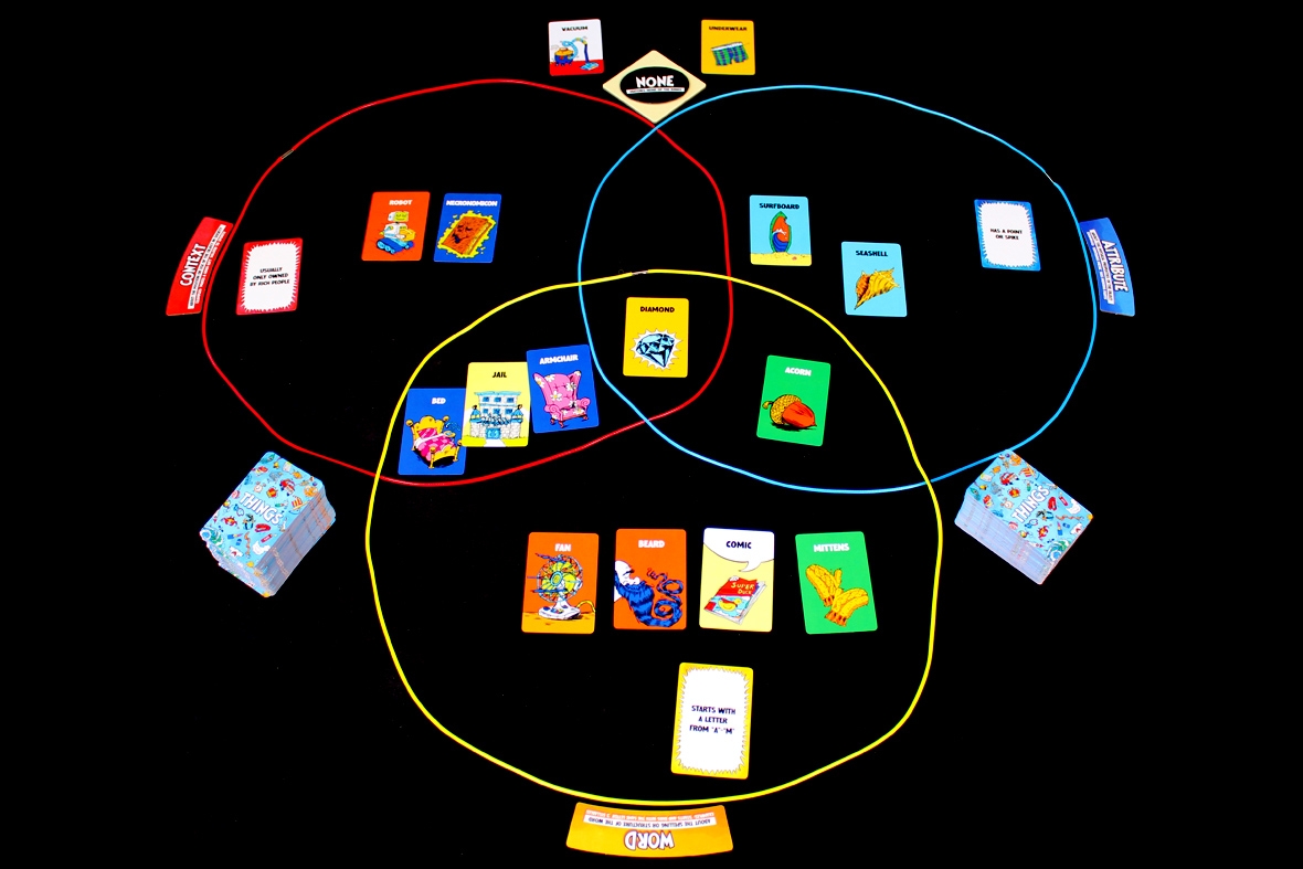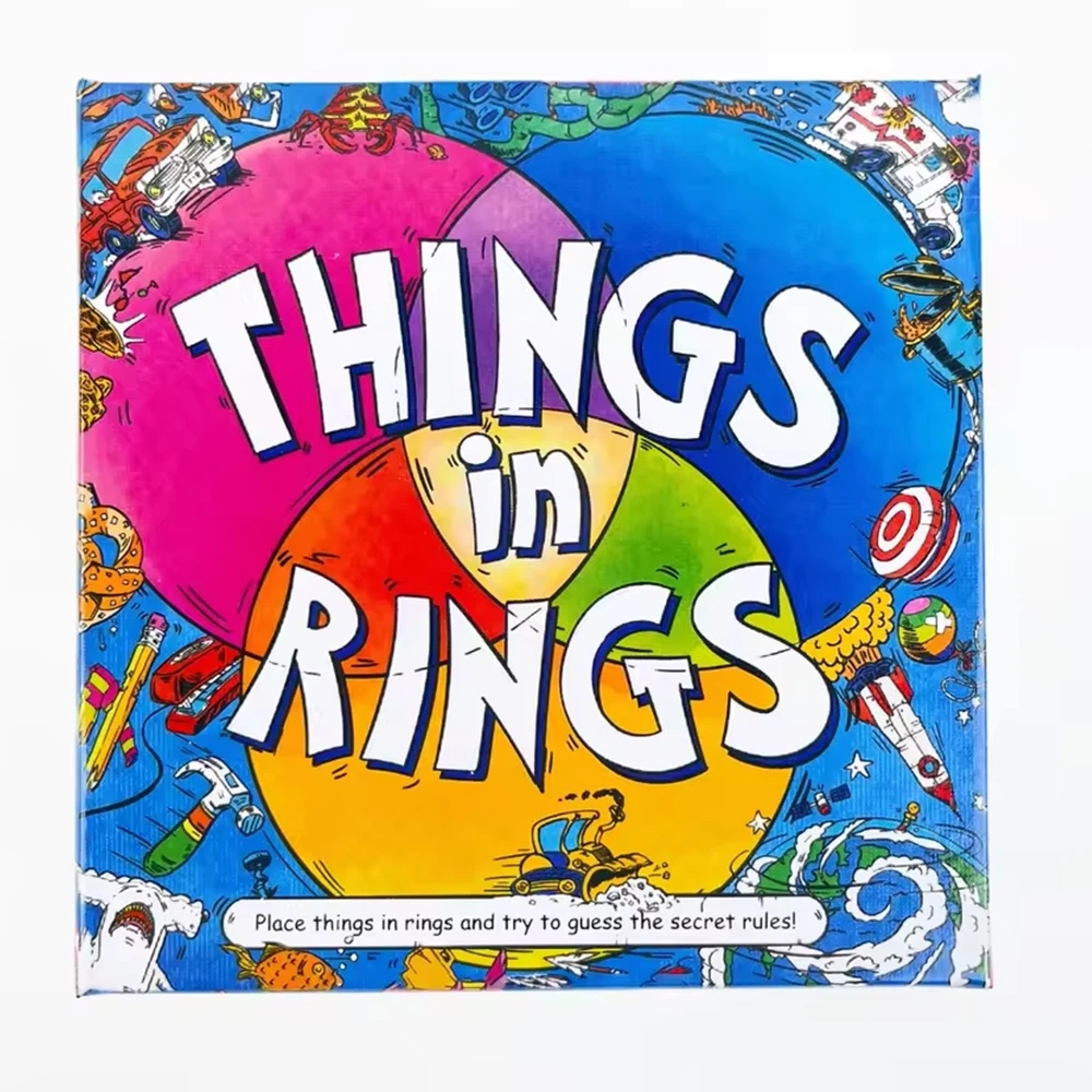 In things in rings, players take turns drawing cards and placing various objects within a ring on the game board. The goal is to strategically arrange the objects to match the patterns on the cards and score points. With each round presenting new challenges, no two games are ever the same!